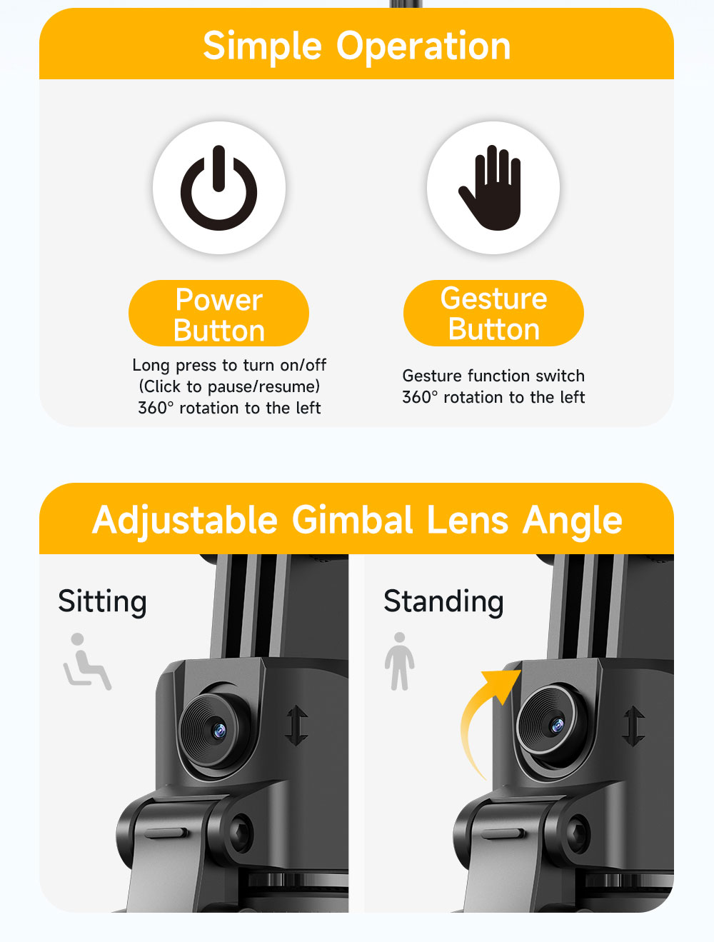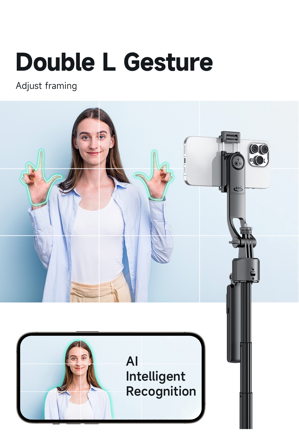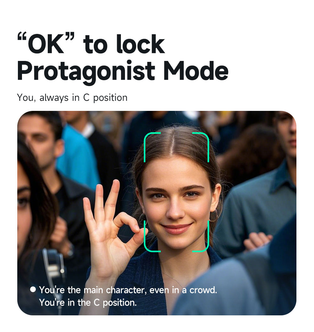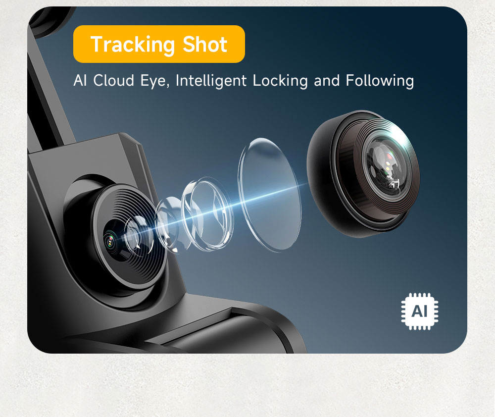 ★ AI Face & Gesture Tracking: The built-in smart sensor locks onto you automatically within a 5-meter range. No remote needed—it smoothly pans and tilts to keep you perfectly framed as you move. Use simple gestures to start/stop recording from a distance.